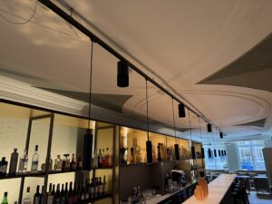 A key part of the hotel is Coley’s Bar, where experience and ambiance are paramount. The goal was clear: an audio concept that fits seamlessly with the interior, both technically and aesthetically. The solution chosen was an installation with Spottune Omni Track speakers, integrated into the existing 3-phase track. This design allows the audio system to merge with the lighting, creating a sleek and stylish result.